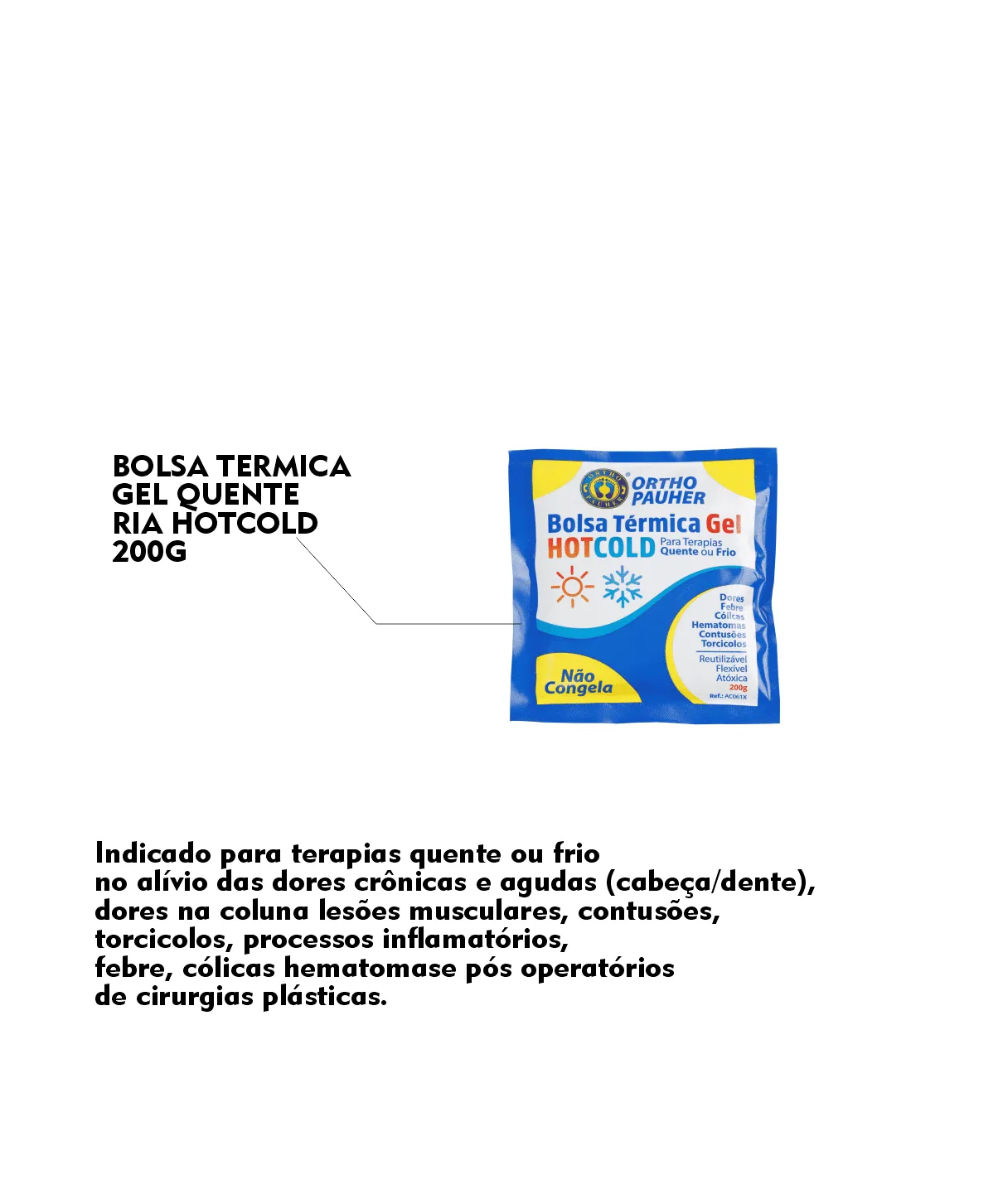 A Bolsa Térmica Gel Hot-Cold é indicada para alívio de diversas dores, como crônicas e agudas, nas áreas de cabeça, dentes, coluna, músculos, contusões, torcicolos, processos inflamatórios, febre, cólicas, hematomas, pós-operatórios, queimaduras, picadas de insetos, dores reumáticas e de ouvidos.