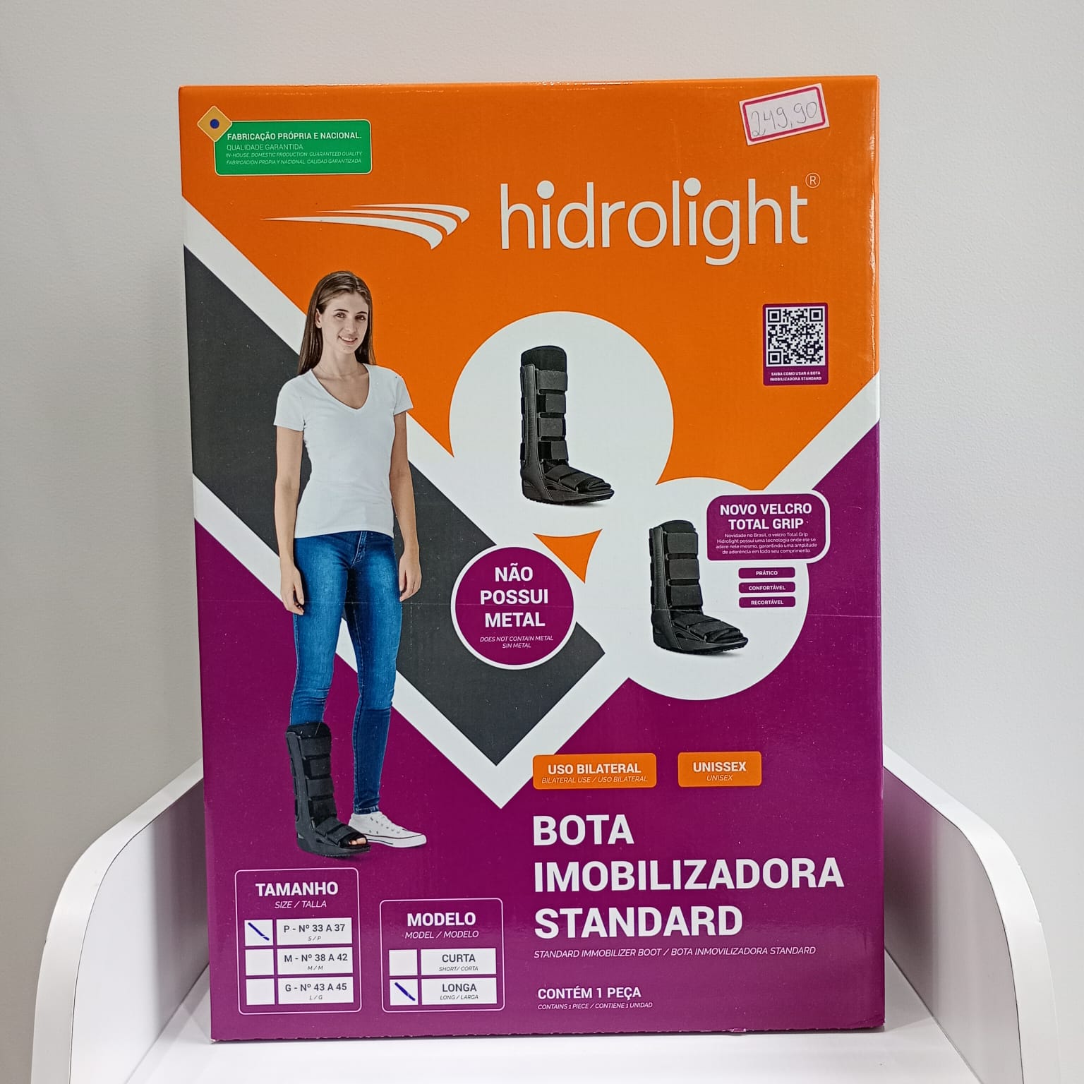 A Bota Imobilizadora Longa P Standard da Hidrolight é indicada para imobilização do pé e tornozelo em casos de fraturas, entorses, luxações, lesões ligamentares e no pós-operatório. Substitui o gesso com mais leveza, praticidade e conforto, sendo uma solução moderna para a recuperação ortopédica.