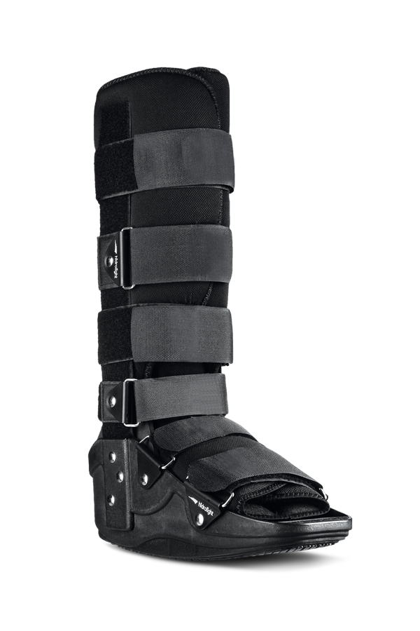 Seu design anatômico permite o uso em ambos os pés (direito e esquerdo) e conta com estrutura leve, sem partes metálicas, o que possibilita sua utilização em ambientes que exigem exames de imagem, como raio-X ou ressonância magnética. O interior é acolchoado e ajustável com cinco faixas em velcro, proporcionando encaixe seguro e confortável ao usuário.