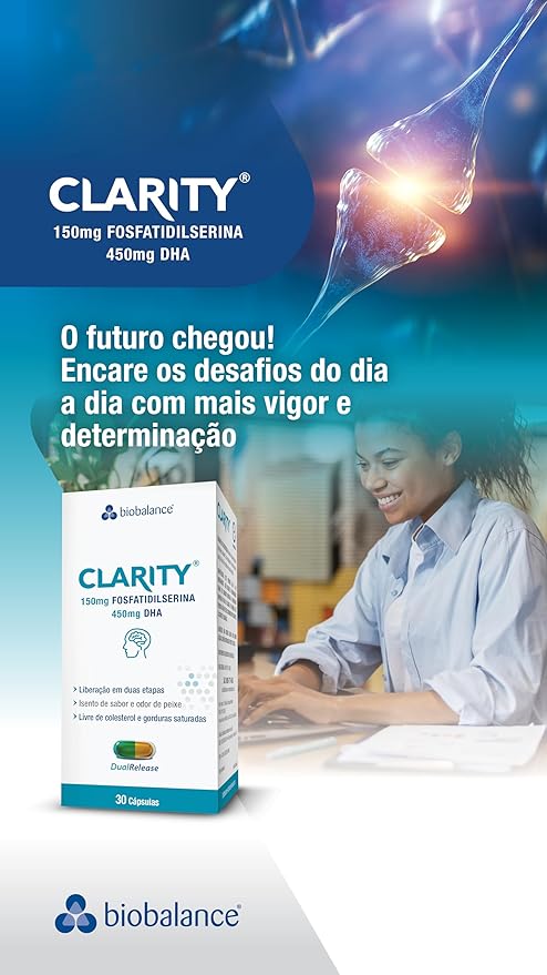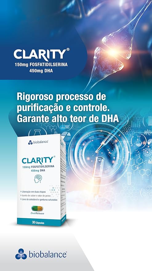 O CLARITY da BIOBALANCE é um suplemento desenvolvido para apoiar o desempenho cognitivo, a concentração e a saúde do cérebro. Sua fórmula combina dois nutrientes essenciais para a função cerebral: