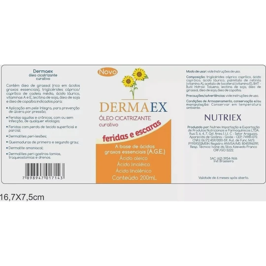O Óleo A.G.E da Dermaex é indicado para cuidados com a pele, auxiliando na cicatrização de feridas, escoriações, queimaduras leves, assaduras e outras lesões cutâneas. Sua fórmula é rica em ácidos graxos essenciais (AGE), como os ácidos linoleico e linolênico, que atuam na regeneração celular e na formação de uma barreira protetora sobre a pele.